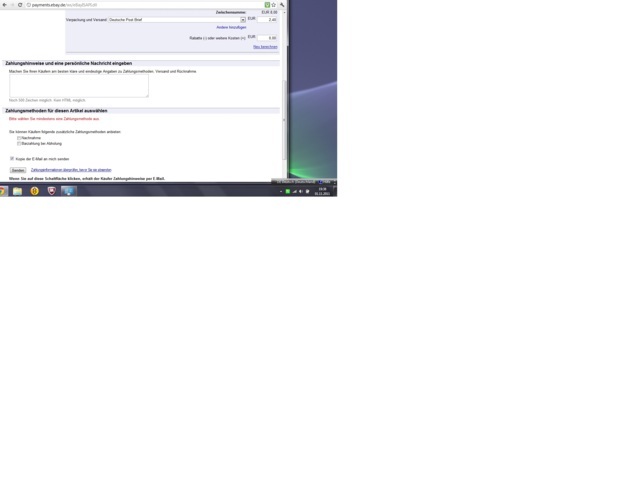 Покупатель меня спросил могу ли я выслать обе вещи в одном, сократив почтовые расходы. Я именно так и хотела сделать, попытавшись сделать рехнунг с изменениями, кликнув на в меню Mein Ebay--Verkauft--Aktion--Zahlungsinformationen senden. Тут мне открылось злополучное стандартное окно с собственно рехнунгом, где я успешно с Вашей помошью (спасибо еще раз) смогла переделать Versandkosten. Но внизу формуляра нужно было еще выбрать какой=то один из способов оплаты, где как я поняла раньше покупатель мог выбрать каким способом он оплатит товар. Вот перечень этих способов оплаты у меня и отсутствовал (что в принципе логично, т.к. деньги должны все равно переводится сначала ибэю). Но моя проблема была и есть в том, что не выбрав никакого способа оплаты и нажав на "senden" с тебя снова