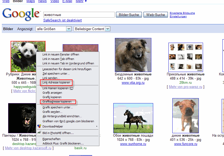 Сейчас опять открыла гугл,написала животные,потом подвела мышку к картинке,нажала правой мышкой и у меня нет таких команд "Link- Adresse kopieren" и "Grafikadresse kopieren"