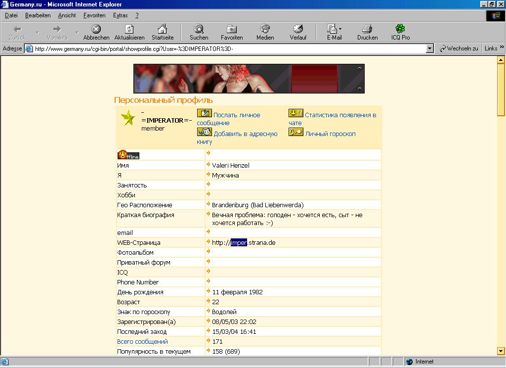 ты не понил как всегда....выбирается АЛИАС имя одно для всего.. скажем у меня нету страничку под velo.strana.de но есть емайл velo@germany.ru, в профиле же у каждого(!!!)показан АЛИАС имя етого человека даже если у того человека нету ни альбома ни страничку и нету желания показывать кому либо свой емайл. Речь идёт о НЕАКТИВНОЙ ссылке в моём и других профилях http://pokurim.strana.de в графе ВЕБ СТРАНИЦА. вот это мне очень не нравится а самое главное я не могу её оттуда стереть. вот тебе и ответ откуда брали спаммеры емайлы для рассылки если девушка к примеру ранее зарегестрировалась на германи.ру и болтала на форуме и не юзала майл совсем свой, то её емайл вычисляли по АЛИАСУ...это ответ на прошлые беды и просьба изменить это.