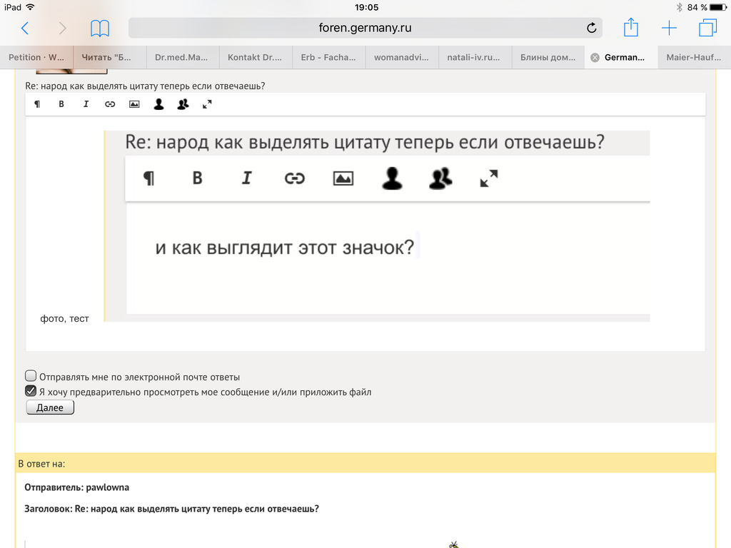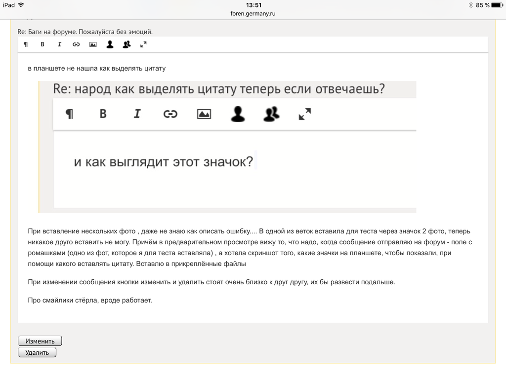 При вставление нескольких фото , даже не знаю как описать ошибку.... В одной из веток вставила для теста через значок 2 фото, теперь никакое друго вставить не могу. Причём в предварительном просмотре вижу то, что надо, когда сообщение отправляю на форум - поле с ромашками (одно из фот, которое я для теста вставляла) , а хотела скриншот того, какие значки на планшете, чтобы показали, при помощи какого вставлять цитату. Вставлю в прикреплённые файлы