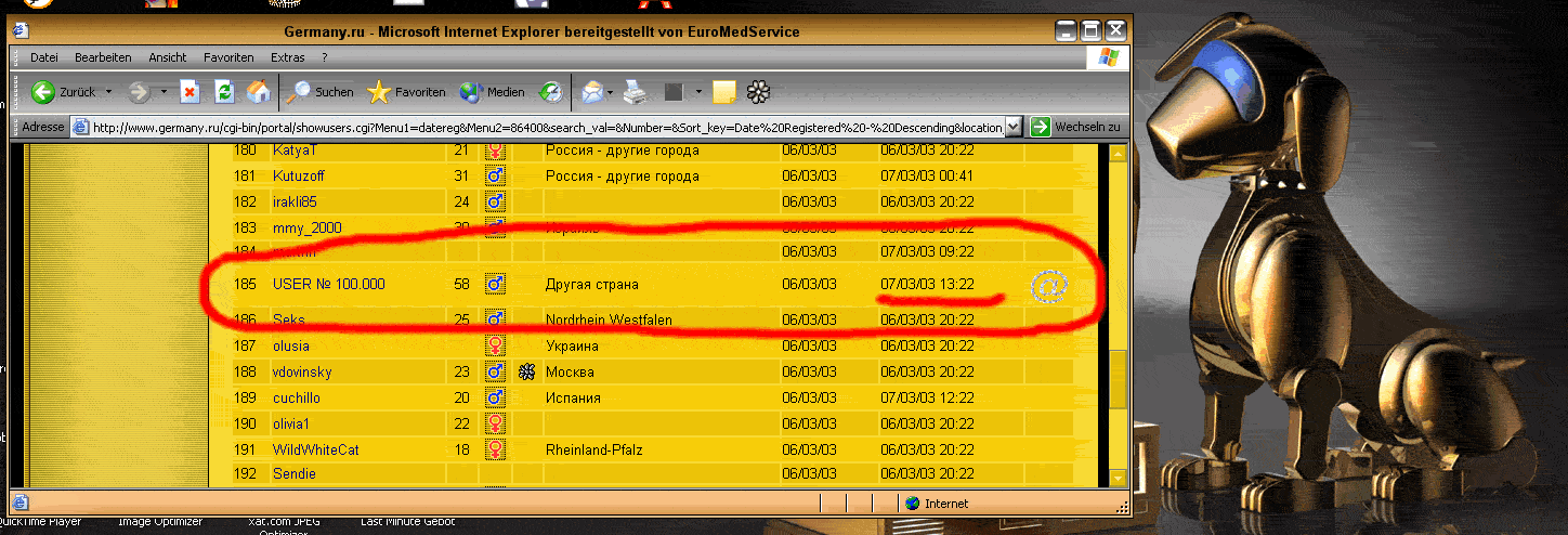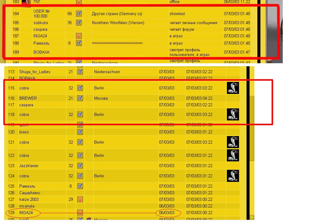 ну вообще класно, счетчик перешагивает 99999-й рубеж 7.03.03 в 1:32 а Ник зарегистрированный 07/03/03 16:16 становиться 100000-м.