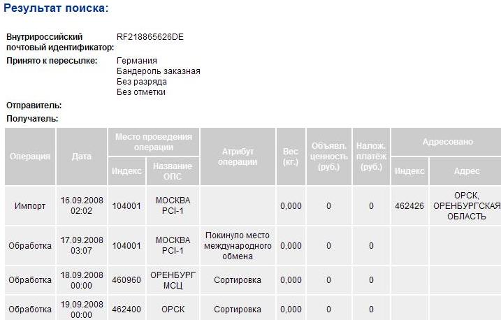 отправил 09.09.2008 ушло 11.09. 2008 из германии в Орск