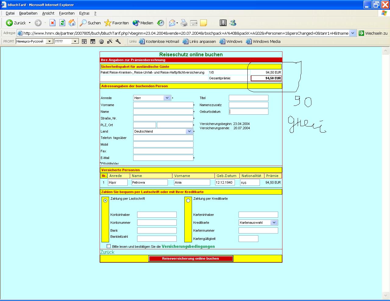 Действительно!, exakt: 94,50. Super! Danke schön. Это конечно уже не 204,60. А вообще-то странно немного: даже если ещё сверху добавить 30 дней новой страховки, получится всего на 48 с "копейками" дороже, а всего на пару дней больше, уже 110 евро "+". А вообще - хороший "тип" конечно. Спасибо. А то бы я снова традиционно отправилась в АDАС.
