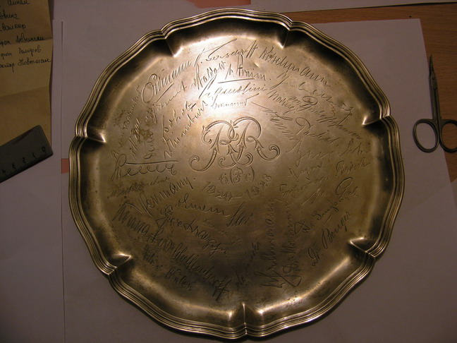это серебряное блюдо попало в россию во время войны. вполне возможно еще живы те люди,которые оставили подписи.