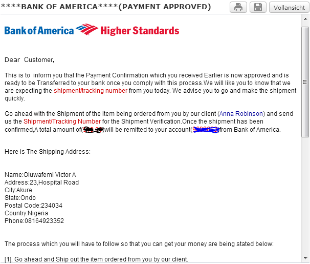 Выставил одну вещ на продажу на 3 дня .тут мешду делом нашолся покупател из америки денги мне щроде как выслал через Банк оф Америка переписка с покупателем велас на английскомо