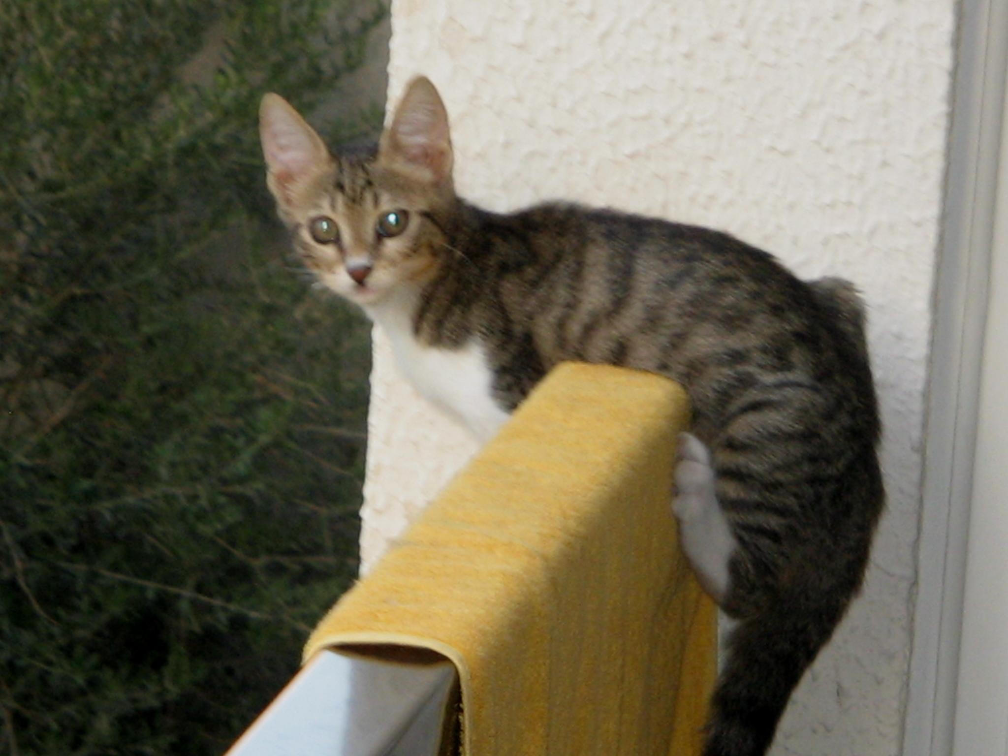 кошечка-подросток, предельно подвижная, повадилась лазать и ходить по перилам балконным.
