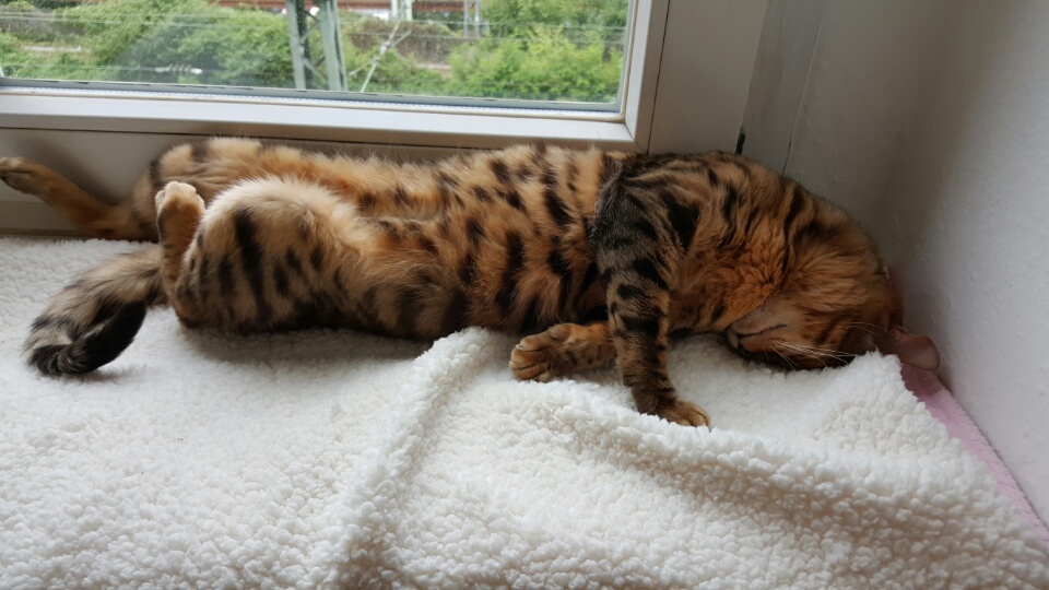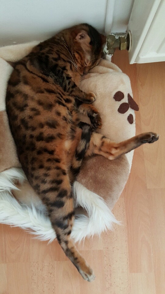 Раньше Челси спала исключетельно "камнем" на моей спине или ногах, с появлением мелкой в доме, перестала спать с нами, только в лежанке (хнык).
