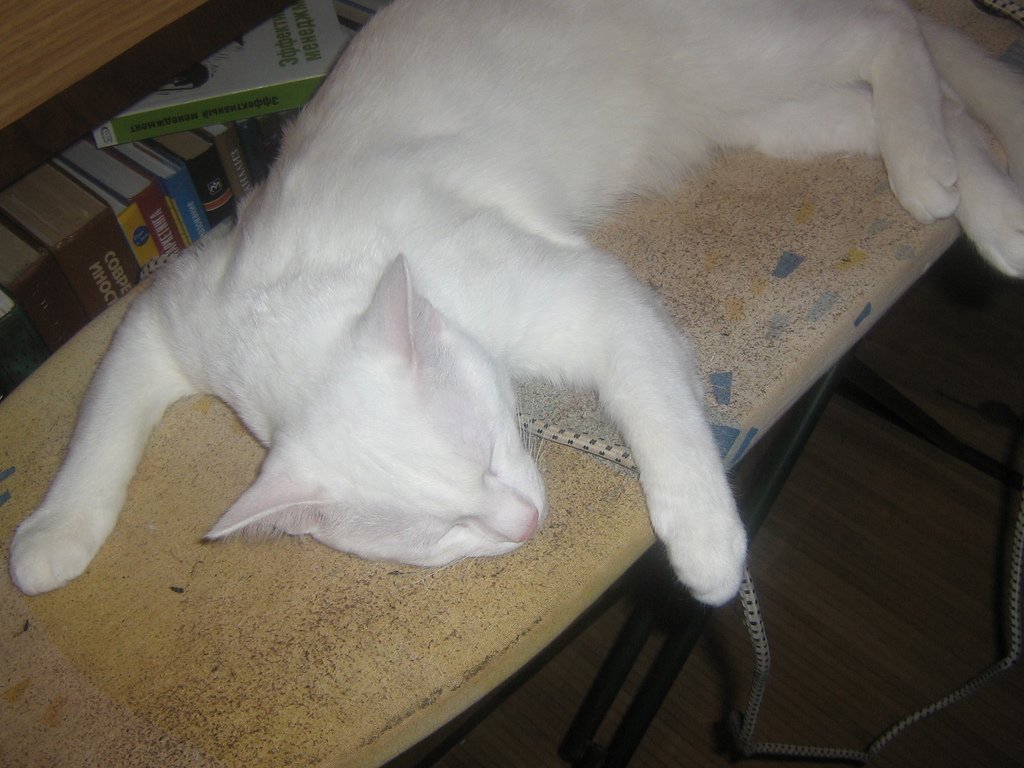 Как-то хозяева небелого кота услышали в подъезде писк, но не знали, что делать, не планировали расширение поголовья в своей крохотной квартирке. Наутро писк продолжался. Они заколебались. "Ну если бы уж хоть беленький был," сказала хозяйка. Пошли смотреть, нашли что-то непонятное, цвета помойного чебурашки. Но стало совсем жалко, и взяли. На четвёртый отмой оказался-таки беленький! Старший кот взял над ним шефство, спал с ним и переживал за его косяки. Как-то хозяйка ругала белого за нагаживание в ванной. Небелый напряжённо ждал у дверей, потом понюхал под хвостом у белого, нахмурился и покачал головой, это была умора!
