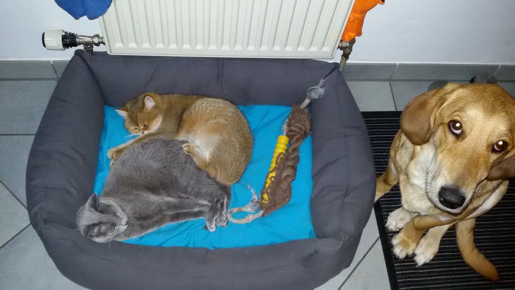 Мелкая "Жужу" с нами тоже не спит, но перед сном укладывается в позе "брачного советника", чтобы мы её в четыре руки наглаживали и усипусничали, какая она у нас замечательная, как засыпаем, она уходит и спит в лежанке.Приходит утром, как будильник услышит и будит мужа, облизывая-покусывая, то руку, то нос