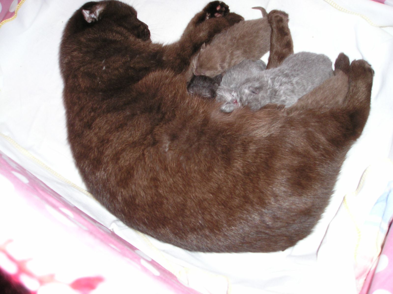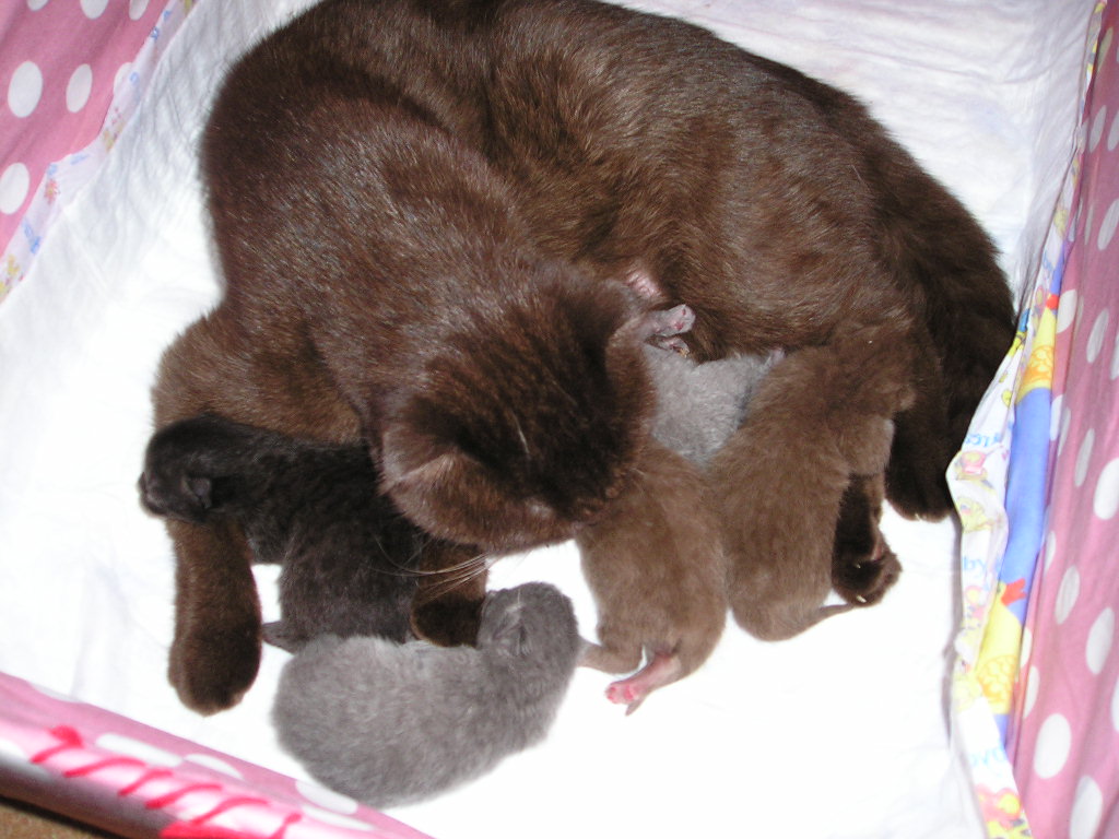 Сегодня 8 марта у нас появились 5 очаровательный котенка, 3 мальчика (черный шоколадный и голубой) и 2 девочки (шоколадная и голубая). Шоколадного, голубого и черного окраса. Кто из них Scottish а кто BKH будет видно через две, три недели.