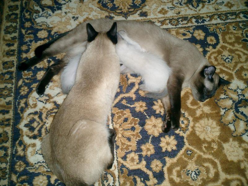 Я таким вещам умиляться не перестаю. Моя кашка-сиамка тоже дама сердобольная и безотказная. Кормит и своих и чужих котят. Да╦т даже полакомиться коту, который е╦ покрывает. Посмотрите.