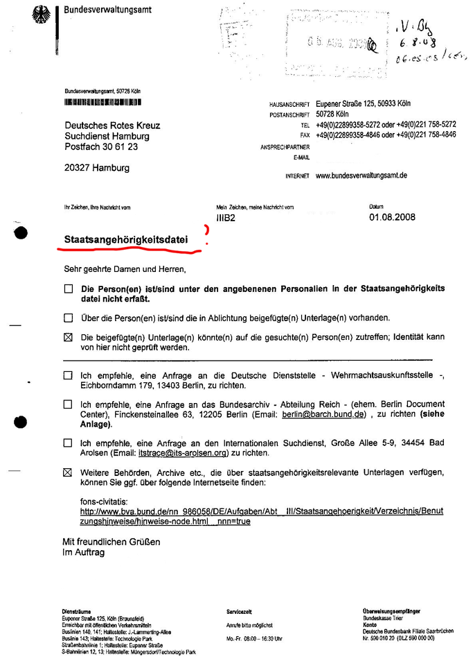 Да. в Бундесархив первым делом обращались, но от туда пришел ответ что не нашли ничего, потом обратились в КК, их изыскания тоже не привели ни к чем конкретному, кроме выписки из BVA о том что записи о данной семье есть, но их невозможно идентифицировать.