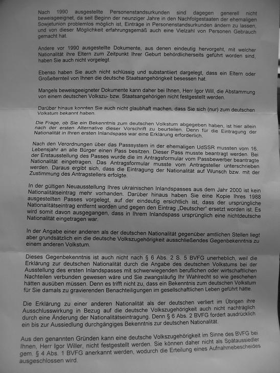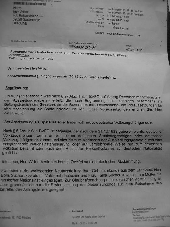 В 2002 году подал антраги,антрагштеллером был мой дед,гражданин германии,получивший гражданство в 1943 году,и имевший германский паспорт. Проживал в Украине. После двухлетнего ожидания,я получил приглашение на шпрахтест(деду не нужно было т.к. на момент ему было за 80)Успешно сдал,т.к. проблем с немецким не имею. Далее,прошло с момента подачи 10 лет. Дед умер. О чем я сообщил в Амт,после чего буквально через месяц я получил отказ,с формулировкой что лично мои документы выданы после 2000 года,а копия паспорта с указанием национальности(СССР)-вообще поддельная. С документами так ая ситуация возникла следующим образом,мой отец родился на спецпоселении в 1949 году,и его записали на бабкину фамилию. В 2000 году,я решил попробовать выехать на ПМЖ,и сдуру сменил фамилию на фамилию деда,что повлекло за собой смену всех документов,начиная от вод.удостоверения и т.д.