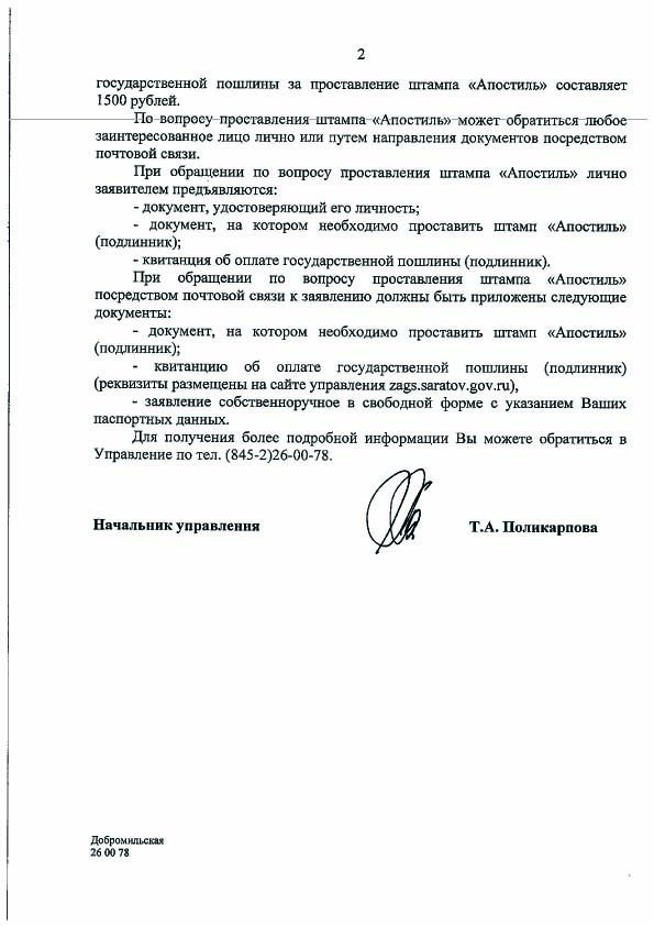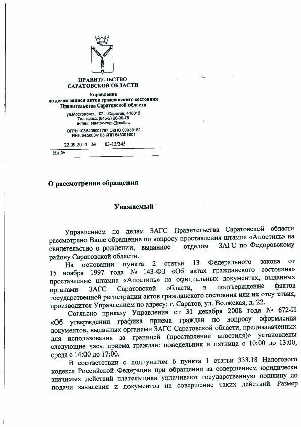 Моему отцу нужно ставить апостиль в Саратове, а он живет в Москве. ЗАГС пишет: присылайте почтой оригинал СОР, квитанцию, что оплатили госпошлину 1500 руб. и письмо в свободной форме. Еще нужно обязательно указать в письме адрес своего местного ЗАГСа, они туда пришлют СОР с апостилем.