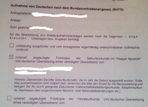Может быть,кто-нибудь сможет мне помочь,спрошу в этой ветке,чтоб не открывать другую.. Пару недель назад получила письмо из БВА (антраг ставила мама,я здесь доверенное лицо), в котором стоит,что я должна доложить документы,в числе которых мамино СОР. Но СОР у мамы повторное,было получено в 1972г.,у меня же требуют оригинальное ,т.е. первое,которое было потеряно..Если мы не можем отослать первое СОР,то мы должны доказать родство между мамой и дедушкой. Собственно вопрос: какие документы могут послужить доказательством? У мамы есть справка о реабилитации,в ней стоит,что она была репрессирована со своим отцом,таким -то таким-то, по причине принадлежности к немецкому народу (не дословно конечно,но смысл такой),ФИО мамы и дедушки стоят на справке. Подойдет ли она? И нужно ли ее заверять или достаточно только перевода? Заранее спасибо за