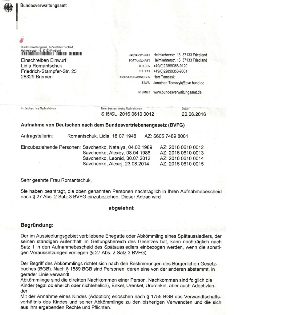 выложите отказ. Что-то я не помню, где в законе к потомкам предъявляются требования к "связи с немецкой нацией", к воспитанию внемецких традициях
