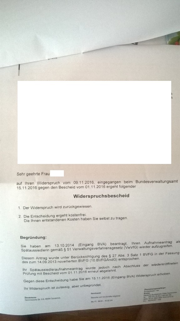 Ты что мелешь ? От матери отказываешься из за того , чтобы поехать в Германию , мать называешь функционером или там кого из своих родных? Да , тебе первому ОТКАЗ !!!!!!!!!!!!! Переживай , очень сильно , ты получишь отказ на всегда , на всегда, без права всех аппеляций . У тебя будет отказ. Даже Германии предатели не нужны , тот кто отказывается от родных , самый первый предатель .