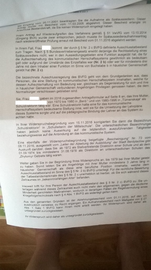 Уважаемая, не пишите бред пожалуйста. Я не отказываюсь от матери. Моя мама изначально подавала антраг, для того, чтобы её дети (я в том числе) имели возможность уехать в Германию. По поводу функционера - вы кавычки заметили? Я не считаю свою бабушку функционером, именно поэтому я и писал протест на отказ моей маме. А по поводу отказа мне - обоснуйте, по какой причине мне может быть отказ, если я не попадаю под параграф 5