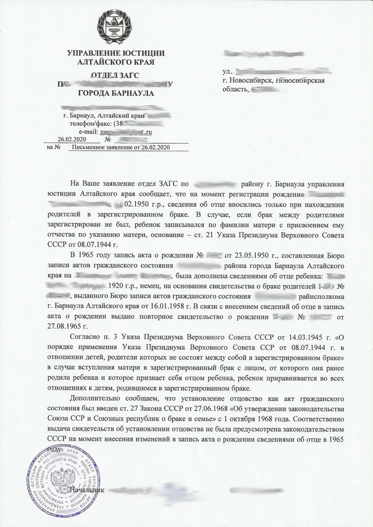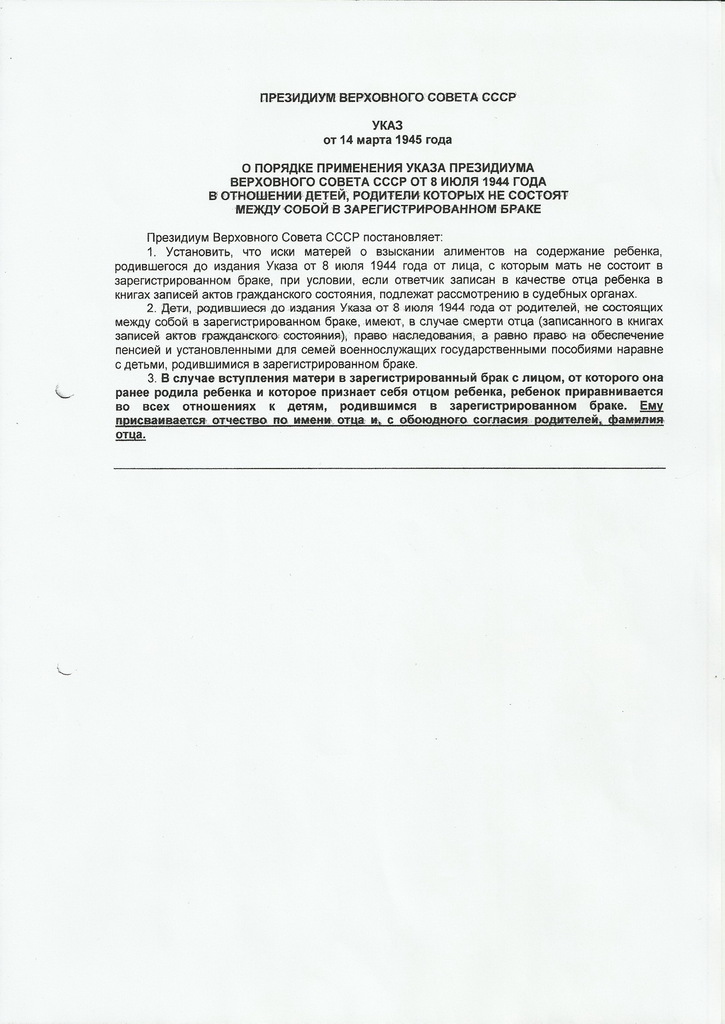 Мы по запросу BVA сначала отправляли справку из загса по ф.4, и после того как она их не удовлетворила и они потребовали предоставить свидетельство об установлении отцовства мы снова обратились в ЗАГС. В ЗАГСЕ нам подготовили информационное письмо, что свидетельство об установлении отцовства в то время выдано быть не могло и дали выкопировку из указа 1944 года.