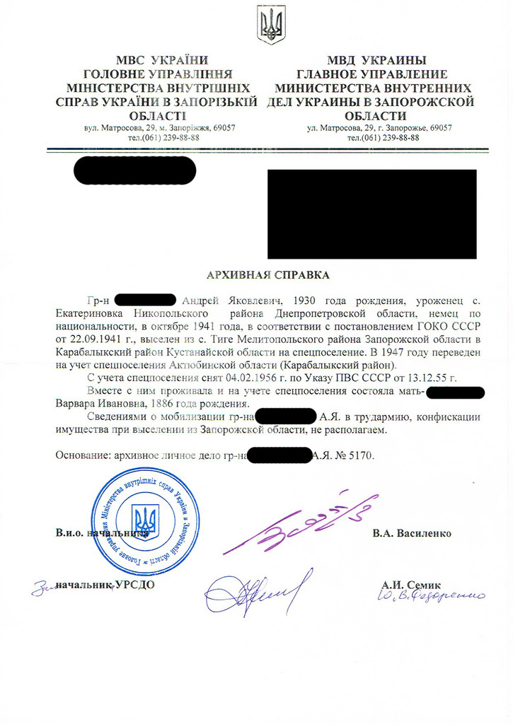 Прошу Вас предоставить мне информацию о имеющихся у вас сведениях и архивных делах на моего деда, *** Андрея Яковлевича, 1930 г.р., уроженца с. Екатериновка, Никопольский р-н, Днепропетровская обл., Украинская ССР (ныне с.Катериновка Никопольский р-н, Днепропетровская обл., Украина).