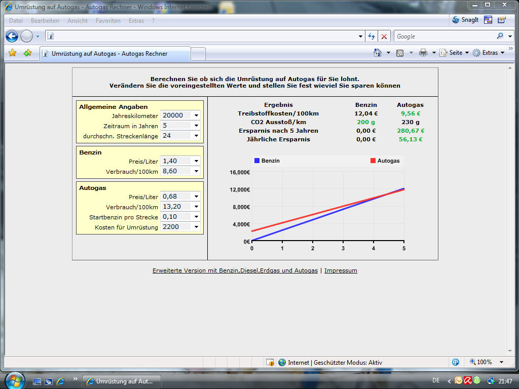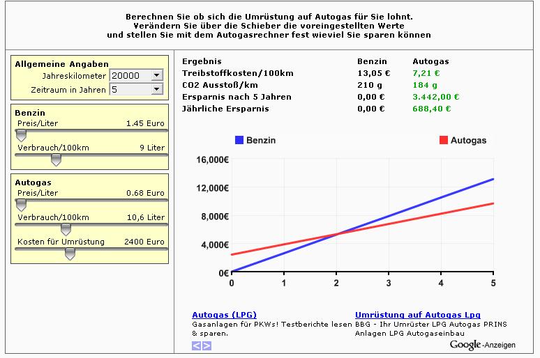 решение для газа: (20000км х 10,56л/100км) = 2112л в год, при цене 0,7е за литр = 1478.4е в год.