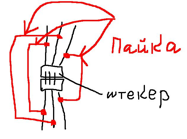 блин опять горит, 20 дней продержалось.Буду перепаивать.Я вот что подумал, а если штекер не разбивать а запоять так ка на картинке.Вдруг не поможет,можно будет всё назат сделать.Как думайте?