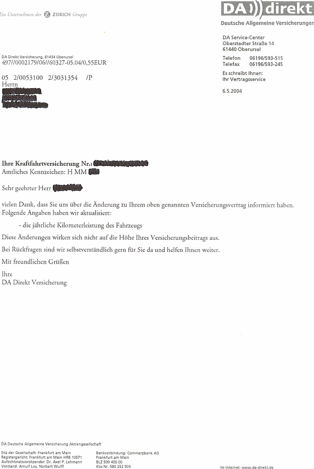 Здравствуйте!Сайт у них:www.da-direkt.de есть ли там рехнер не знаю, Telefonisch Kundenservice: 7X24 Stunden (0180-2424100) 6 cent/anruf.Заключал в Гешефтштеле(37 в Германии)один у нас. А в писме стоит:Folgende Angaben haben wir aktualisiert:die Järliche Kilometrleistung des Fahrzeugs.Diese Änderungen wirken sich nicht auf die Höhe Ihres Versicherungbeitrags aus.Mit Freundlichen Grüsen Ihre DA Direkt Versicherung.