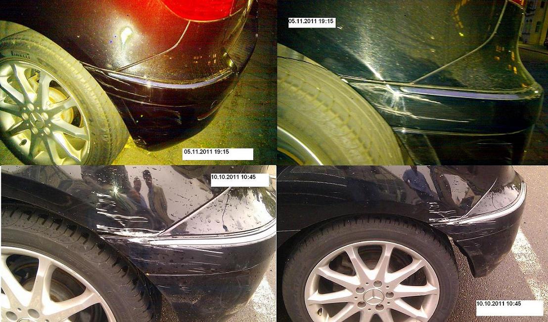 царапины стали намного глубже и размашистей, + вмянита на кузове. моя машина почти не пострадала, краска вся на месте, несколько полосок не до грунтовки на бампере, до матового лака не глубже. есть також царапины на фаре. что здесь против меня - так это то, что царапина на фаре по высоте там же, где основная вмятина на его кузове, но по ширине у меня 3 см царапина а у него 15 см - откуда такое добро взялось !
