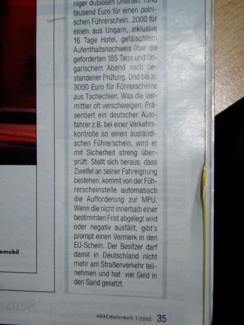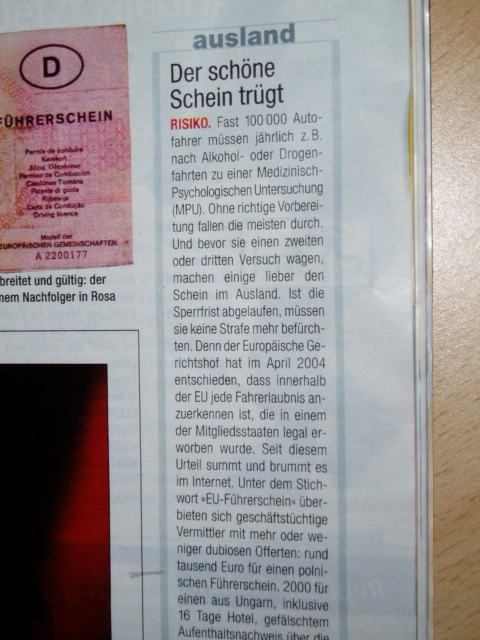 Отдельная строчка о кандидатах на Idiotentest/MPU. На них "нашли управу" в том смысле, что даже при признании прав из Польши, Чехии и т.д. их могут обязать сделать MPU в течении определ╦нного времени, в противном случае по истечениии этого срока в права могут сделать вписку типа "Недействительны на территории Германии", так как национальных законов никто не отменял, даже высший европейский суд...