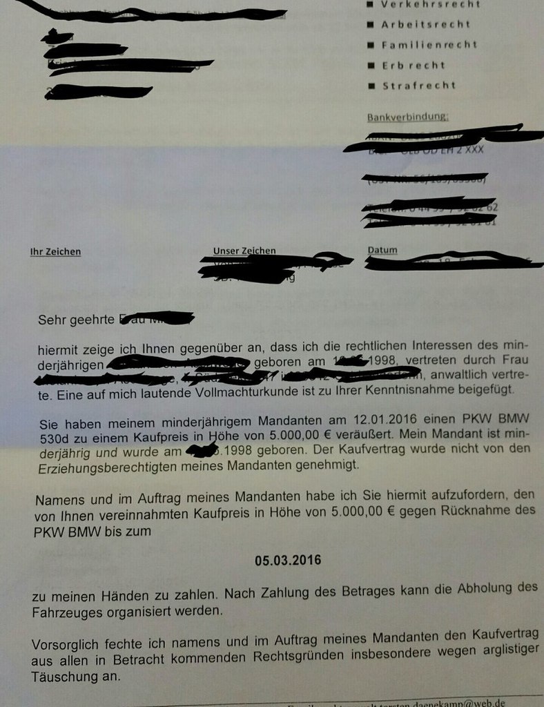 Продал машину.Составили договор о продажи.Человек отдал деньги(немец),я ему ключи,бумаги. Машину погрузили на прицеп и увезли. Про машину забыл. И тут спустя 5 недель пришло письмо от адвоката со стороны покупателя,что он хочет вернуть машину и я ему должен отдать деньги обратно,основываясь на том,что договор подписал несовершенно летний ребенок 98 года рождения и договор не действительный. На вид не скажешь,что ему 17 лет и паспорт я конечно же не просил. При покупке машины находились 2 сына и отец.У меня есть фотография,сделанная когда грузили машину на прицеп,где видно,где отец при сделки присутствовал. Я знаю,что машину ставили на учет в Германии.