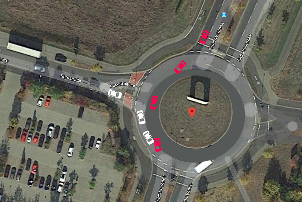 Насчет немецкий правил точно не знаю, учил и сдавал в Швейцарии, поэтому могу ошибаться в данном случае. Так вот, по Швейцарским правилам виноваты Вы... Во-первых, если кольцо двухполосное, а Вам ехать аж до третьего съезда (почти весь круг по картинке), то Вы должны занимать внутреннюю полосу, а не тащиться по краю. Во-вторых, съезжающим с кольца (с внутренней стороны) уступают дорогу. Но, еще раз, это у Свисов. Уточните эти особенности у себя.