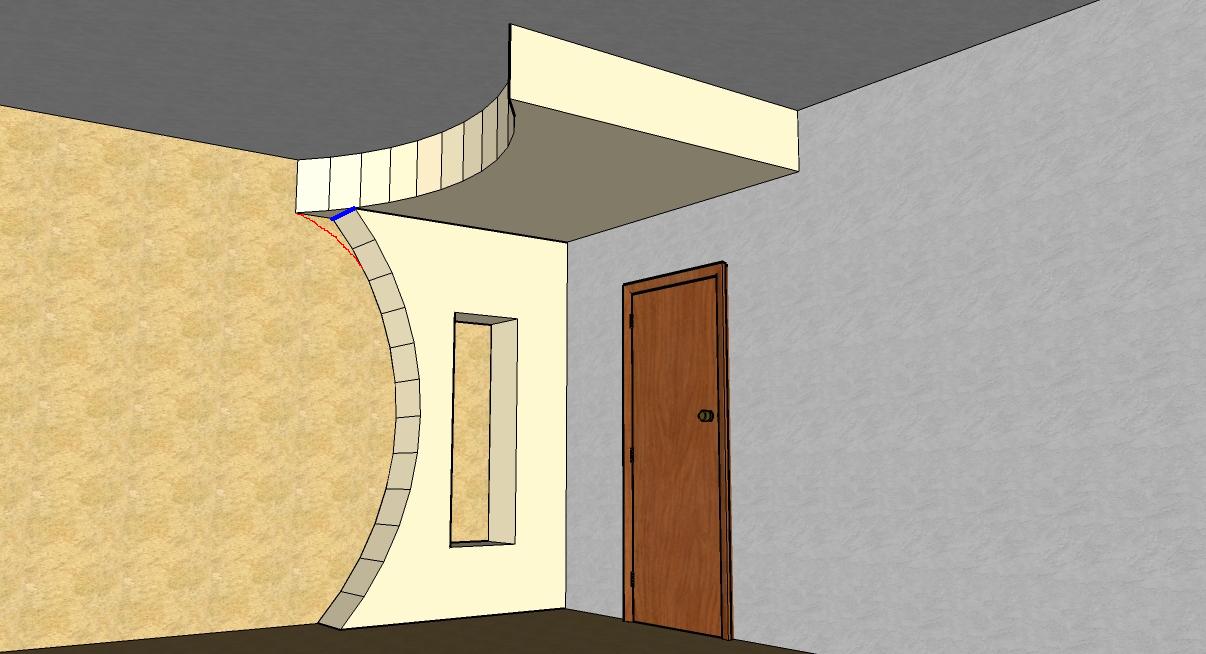 Поскольку я не имею информации о том, что происходит по другую руку от двери, я оставила потолок "как есть". При возможности, я бы продолжила тот же выступ вогнутой дугой.