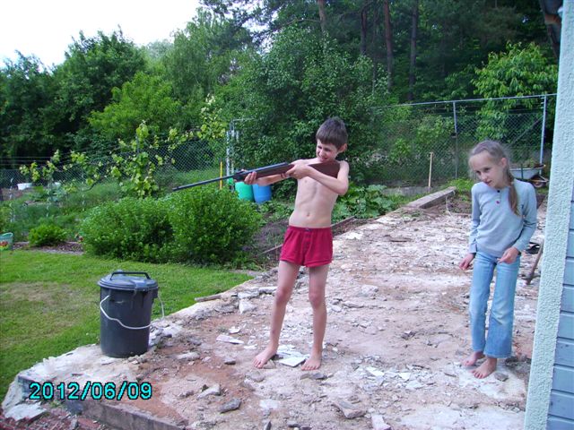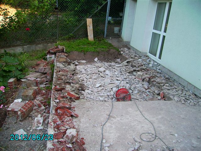 Вообще-то там где лежит катушка для электрокабеля, раньше была цветочница, на первой фотографии видать. Вот её я решил забетонировать, науфиг. Землю выкопал, а вместо земли закидал осколками то что сбил с бетонной платы. Не знаю что это такое, но похоже на естрих. Вот и решил использовать вместо щебёнки.