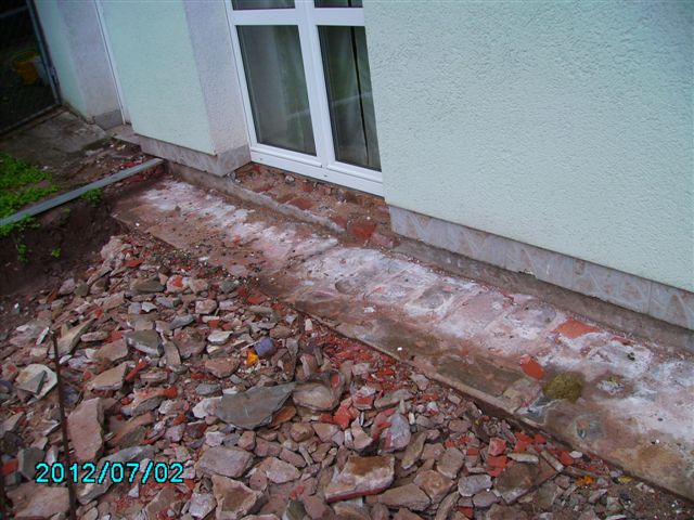 Я когда начал сбивать старый клей, под ним уже оказалась бетонная плата. Также от стены дома идёт бетонная дорожка, на которой сантиметров 8 был клей и камень лежал. Я весь этот клей сбил. А снаружи каменная кладка, которую я начал выворачивать.