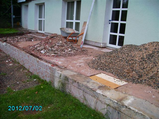 У меня дом на склоне, поэтому просто щебень не получается использовать, так как терраса как-бы над склонном нависает, примерно сантиметров на 80. Старая терраса, чтоб удержать грунт, прежний хозяин на расстоянии, 2,5 метров от стены дома выложил кирпичную кладку. В образовавшийся котлован между домом и кладкой засыпал грунт, щебень, песок и положил камни. Но так как вода проходила через камни террасы, она в итоге вся оказывалась на каменной кладке. То есть каменная кладка никогда не просыхала. Зимой морозы сделали своё дело, и в итоге за несколько лет она превратилась в труху.