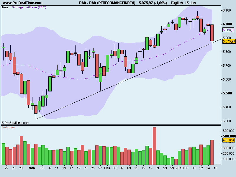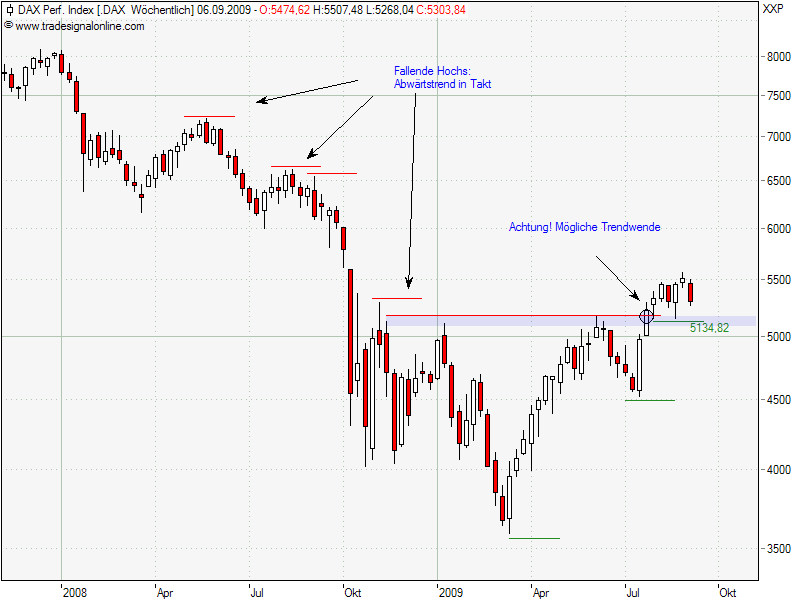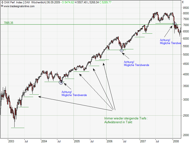 Такие моменты были летом 2004-го и 2006-го. DAX провалился на короткое время вниз, однако на следующей неделе развернулся, заскочил опять на туже "ступеньку" и пошел опять наверх. Другое дело было зимой 2008-го, DAX провалился, но на другой неделе он больше не "запрыгнул" на прежний уровень. Тут либо смена тренда, либо, в лучшем случае боком. В таком случае надо продавать.