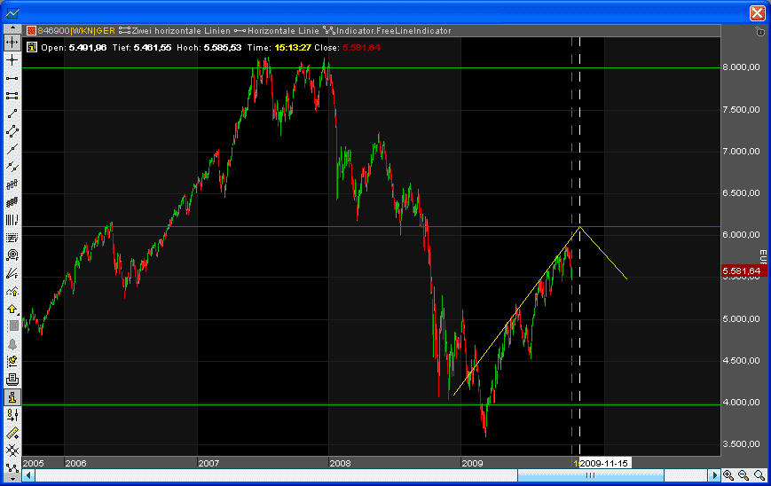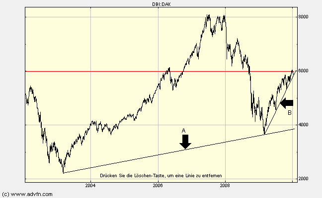Сравни ситуацию на картинке с 2003-ем. Справа ситуация сейчас. Угол подъема один и тот же. В 2003-ем тоже рынок стартанул весною и подымался до самой зимы. 9 месяцев непрерывный Bullenmarkt. Тогда тоже все говорили, что рынок überhitzt, а он шел и шел наверх. Сейчас ситуация похожая.