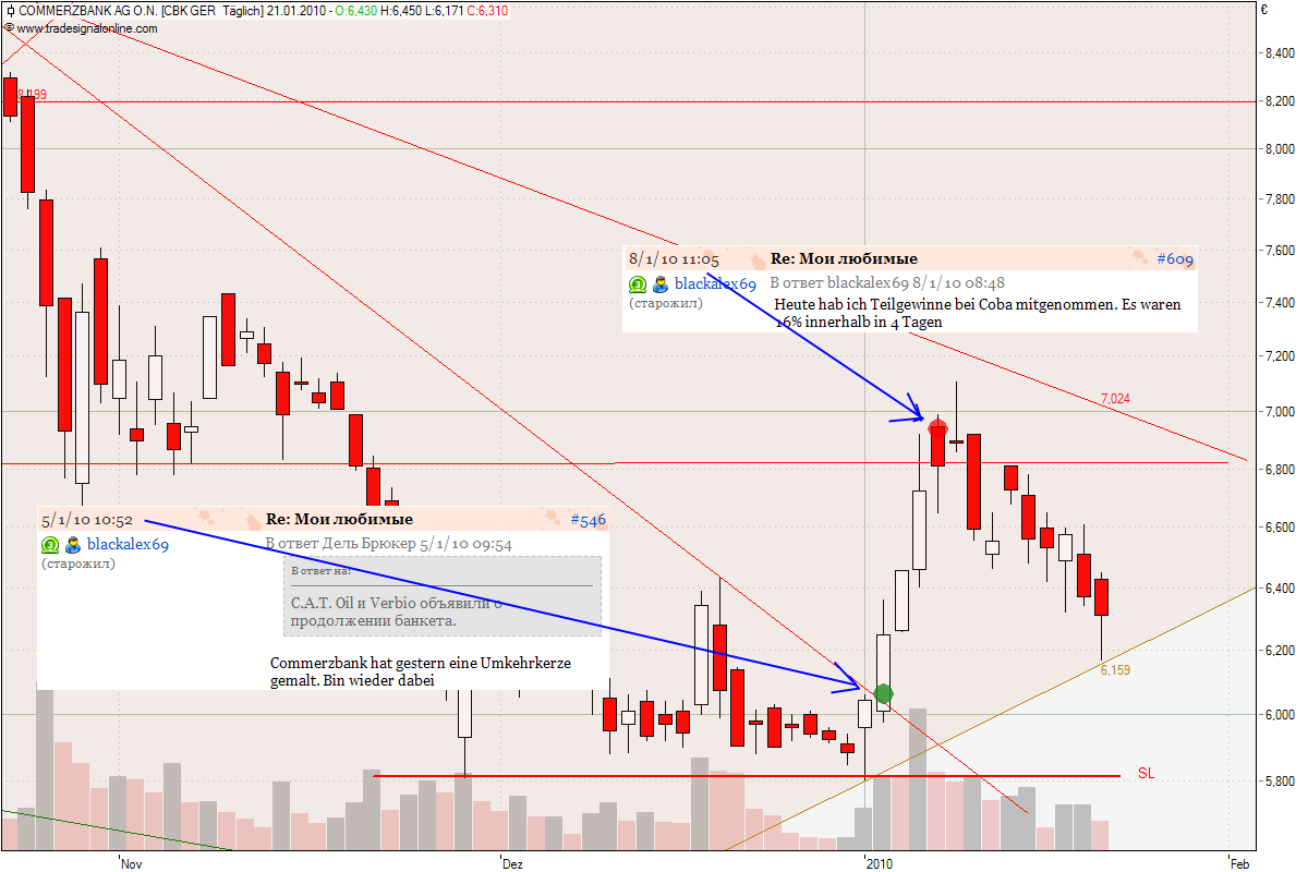 А чего жалеть? Я ведь ничего не потерял, даже небольшую прибыль сделал. А я в пятницу на часть отсвободившегося от Commerzbank капитала купил другую акцию, которая сразу же ушла в плюс %7. А остался бы сидеть на Commerzbanke, был бы сейчас в минусе. Улавливаешь суть? Так о чем я должен жалеть? О том что не ушел в минус