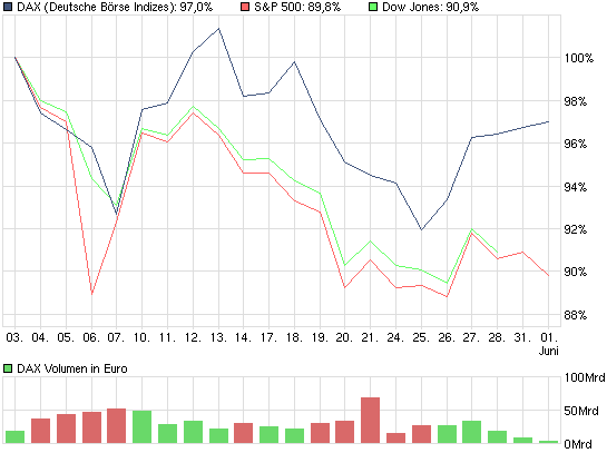 Trotz der krassen Schwankungen bleibt der DAX relativ stark. Für mich gibts nur eine Ursache dafür: die Amis benutzen den günstigen Euro-Wechselkurs, um in die stärksten Volkswirtschaft der Euro-Zone zu investieren, dass bedeutet bald steigender Euro + steigende Kurse