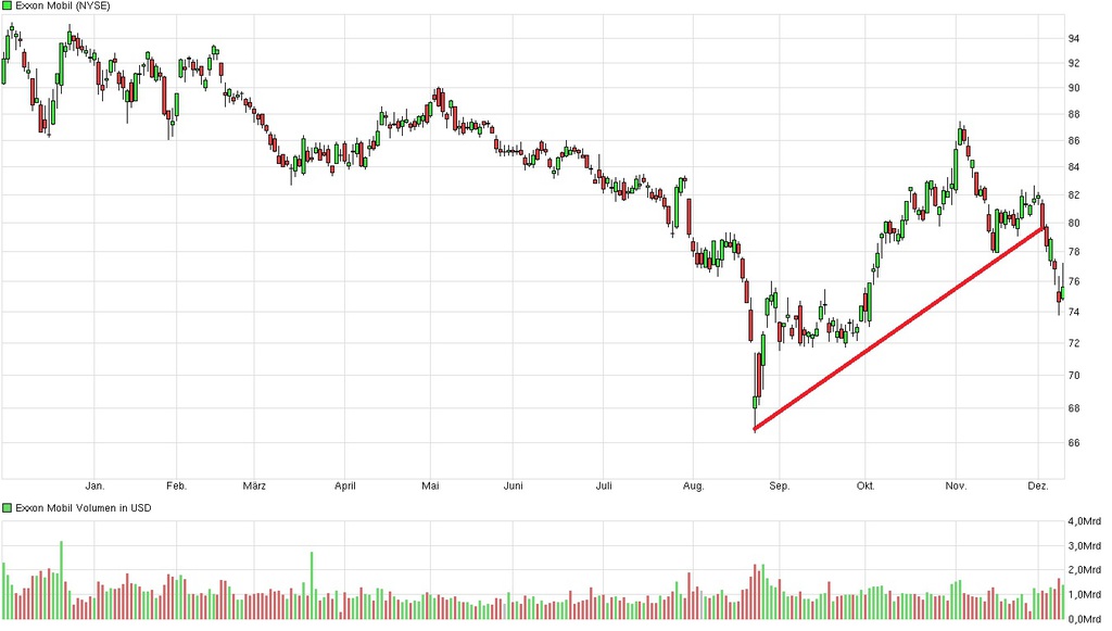 Beim weltgrößten Ölkonzern Exxon fiel der Gewinn im dritten Quartal im Vergleich zum Vorjahreszeitraum um 47 Prozent auf 4,2 Milliarden Dollar (3,8 Mrd Euro). Der Umsatz sank um 37 Prozent auf 67,3 Milliarden Dollar. Obwohl das Unternehmen die Produktion zum Vorjahr leicht steigerte, blieb wegen des massiven Preisrückgangs bei Rohöl viel weniger Geld in der Kasse.