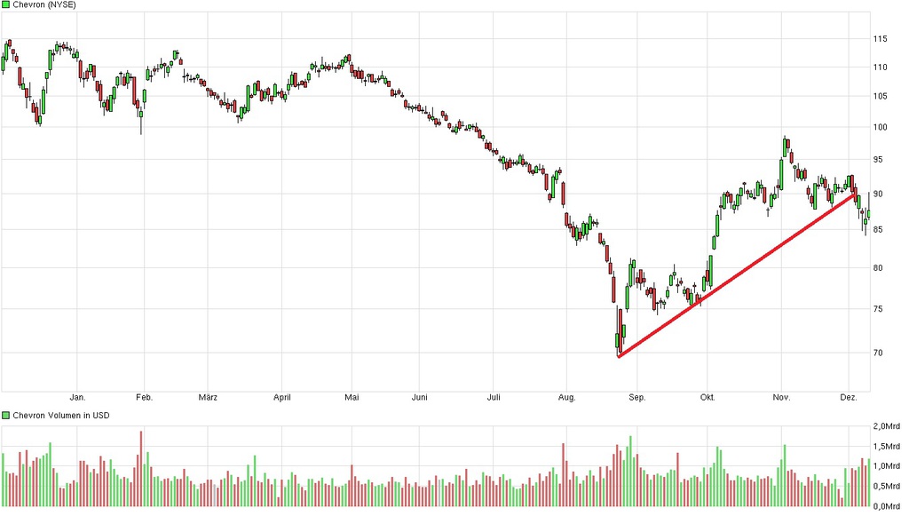 Der Ölpreisverfall bringt die US-Ölkonzerne unter Druck. Der Quartalsgewinn von Chevron schrumpfte verglichen mit dem Vorjahreswert von 5,6 auf 2 Milliarden Dollar zusammen, wie der gemessen am Börsenwert zweitgrößte US-Ölkonzern am Freitag mitteilte. Der Umsatz sank um 37 Prozent auf 34,3 Milliarden Dollar.