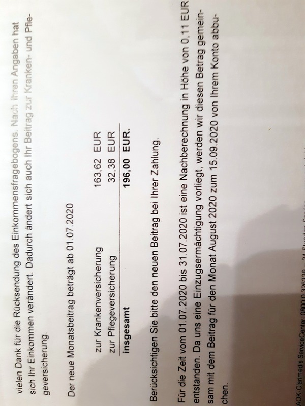 Недавно заполнял анкету и сегодня пришло письмо, что нужно платить 196евро. Также сегодня был телефонный разговор с АОК по поводу этого письма. Ответ был такой: это минимально возможный в моей ситуации уровень оплаты. Моя немецкая коллега, которая мне помогала, сообщила, что даже студентам приходится платить более 100евро...