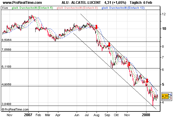 Можно и шажками. Вот посмотри какой xороший тренд у Alcatel. 4 сделки и все в плюс. Может и пятый еще будет. Сел на санки и покатился с горочки. В сторону тренда намного проще торговать, чем против.
