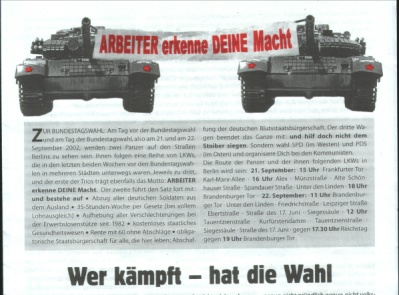 Но кто же голосовал за <SPD>? Например у нас на фирме повсюду валяется куча пропагандисткого материала в пользу "красно-зел╦ных", прич╦м не "наверху", в бюро, а именно в комнатах для отдыха, <Brotzeitecke>, где собираются рабочие. А вс╦ потому, что местные профсоюзы под колпаком у <SPD>, соответственно и промывка мозгов в том же направлении.