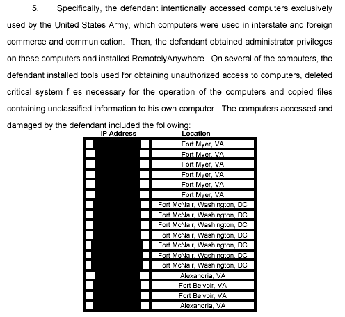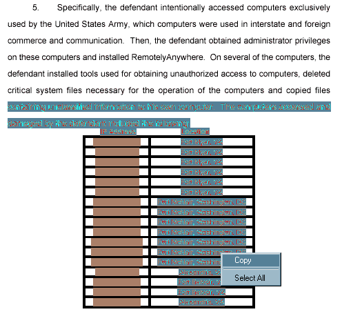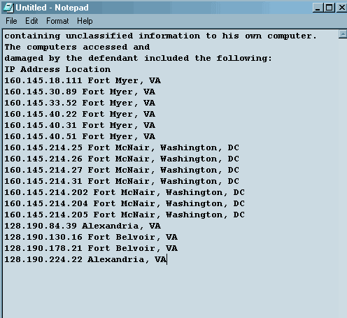 Короче, в США против чувака составлен индиктмент. PDF с этим документом находится Гуглом первым номером на запрос просто с именем чувака (Gary McKinnon) на законохранительном сайте FindLaw.com. В индиктменте, в частности, в рамках построения доказательной основы перечисляются военные базы, куда чувак вломился, названия баз сопровождаются IP-адресами их компьютеров - пострадавших, значит, т.е. взломанных. Пентагон - заведение секретное, а стало быть простым читателям законодательных хранилищ знать IP-адреса военных баз не положено. Поэтому IP-адреса (их там около 100) закрашены в индиктменте ч╦рным:"