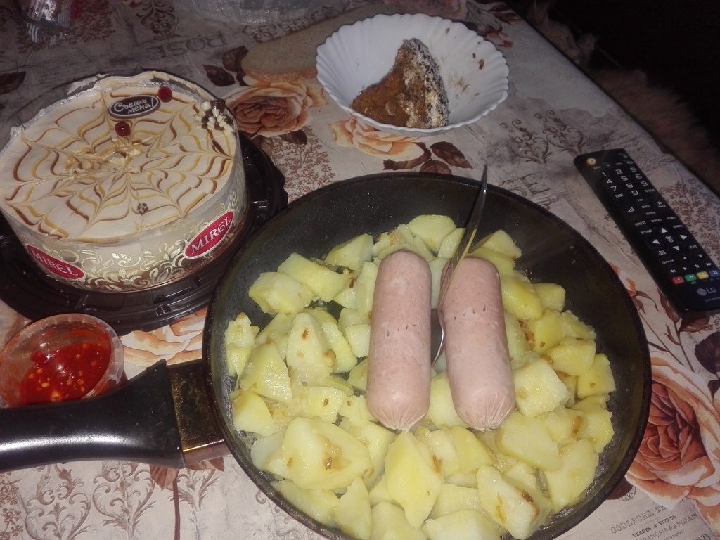 Картошка уже начала прорастать поэтому жена отварила и добавила лука жареного а к чаю принёс пару тортиков небольших по пол кг ![]()