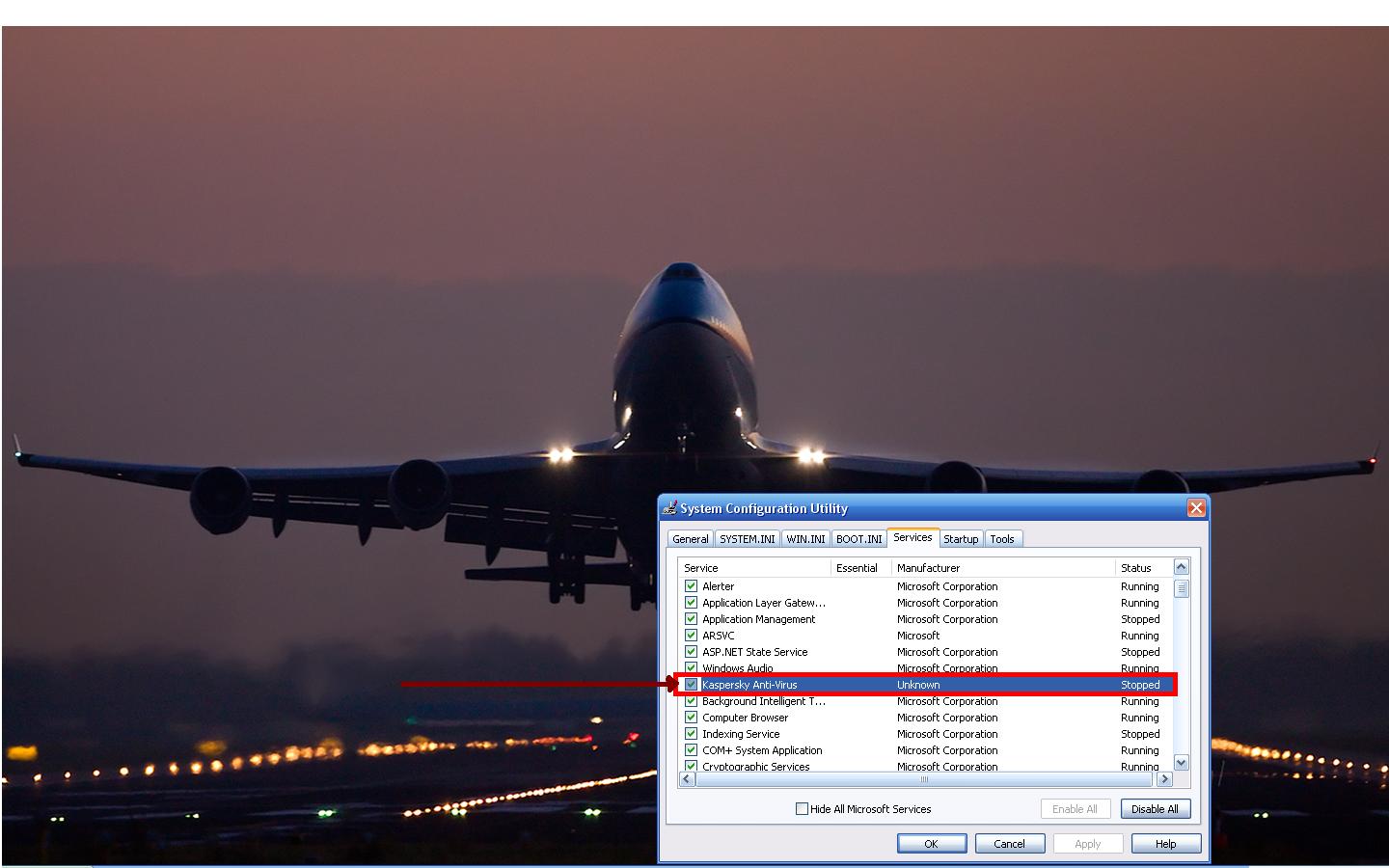 Касперский заблокирован немогу его нигде включить.В Sys config utility показано что выключено ( 1) в Services (2) тоже жму на старт выдает ошыбку 1053.