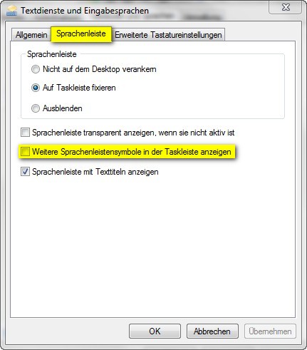 Systemsteuerung --> Zeit, Sprache und Region --> Region und Sprache --> Tastaturen und Sprachen --> Tastaturen ändern... -- Откроется окно: Textdienste und Angabesprachen. В нем выбрать вкладку Sprachleiste (отмечена желтым на скриншоте)