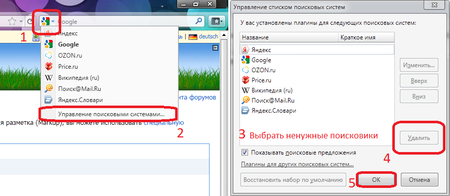 поисковики удаляются вот так. Оставить только нужный или же просто его поднять на самый верх и сделать по умолчанию.