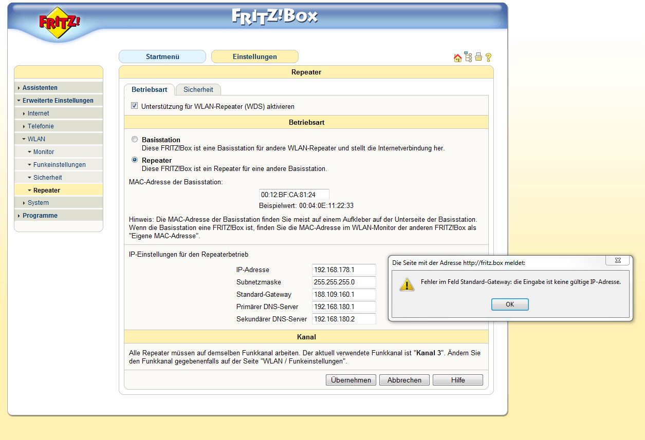 Так как у W500 нет ип телефонии хочу его использовать как модем а WLAN 7113 как repeater, a на нем и телефонию , но вот тут проблемы и начались, немогу правильно настроить fritz , пишит ungültige gateway addresse, что я должен туда вписать?